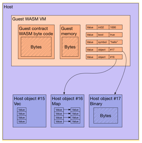 Host objects can be passed (by handle) directly to storage routines or between collaborating contracts. No serialization or deserialization code needs to exist in the guest: the host knows how to serialize and deserialize all of its object types and does so transparently whenever necessary.
